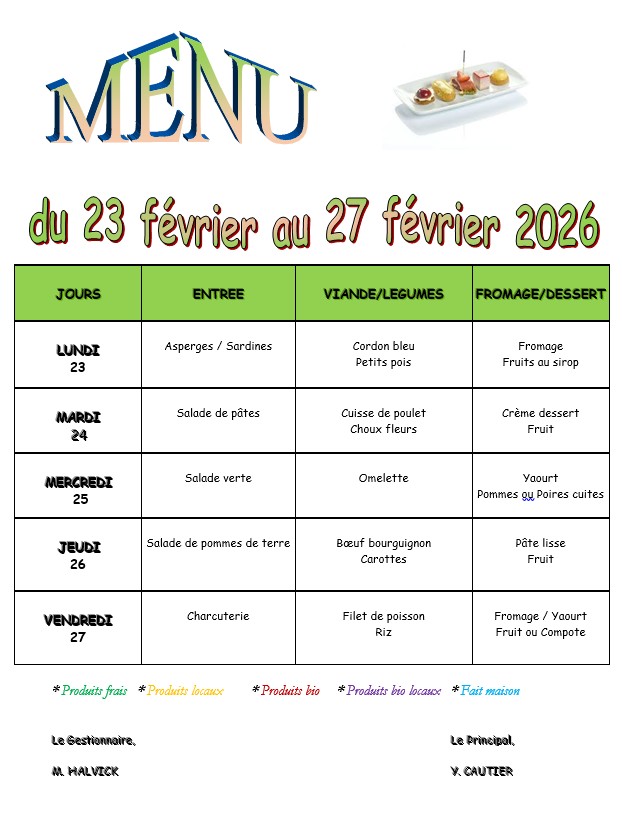 MENU DU 23 AU 27/02/2026