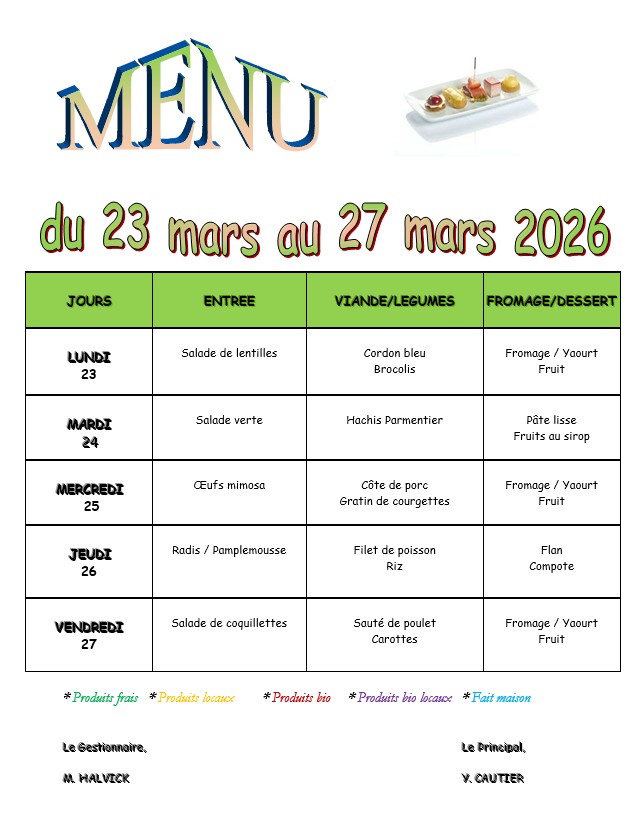 MENU DU 23 AU 27 MARS
