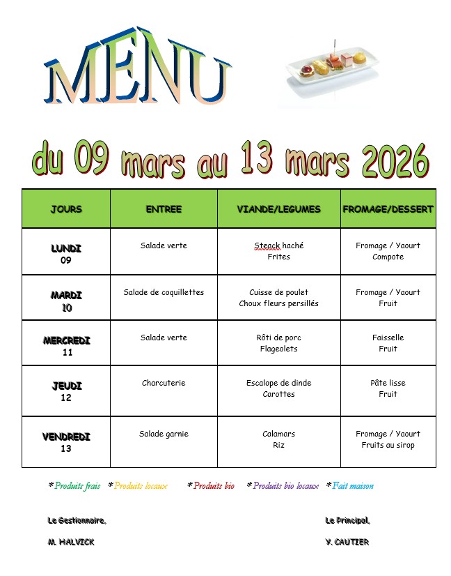 MENU DU 9 AU 13 MARS 2026
